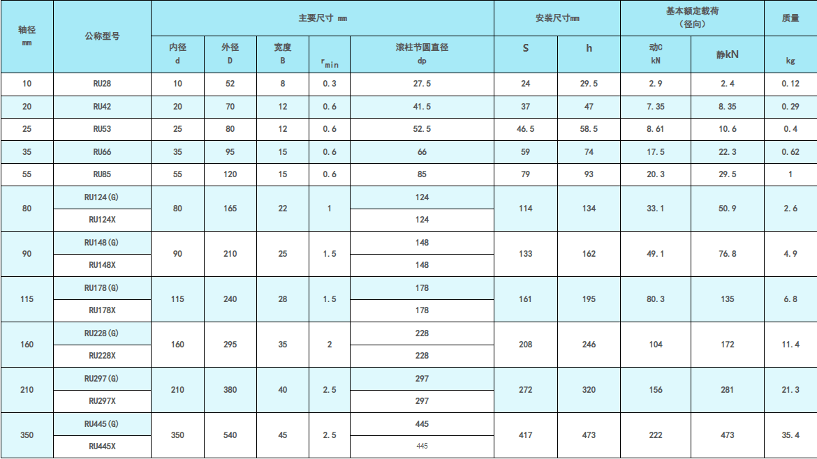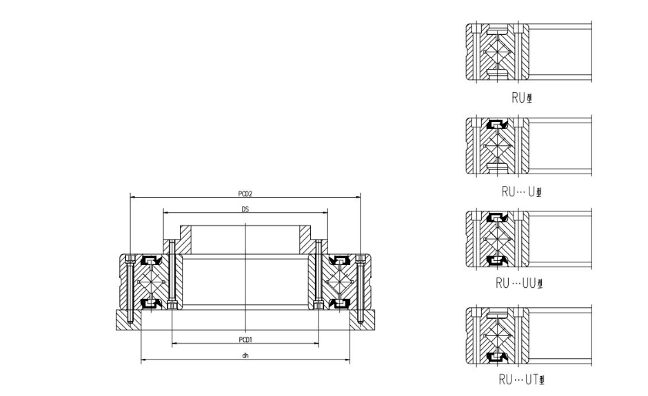 RU交叉滚子轴承的尺寸规格性能表如下: