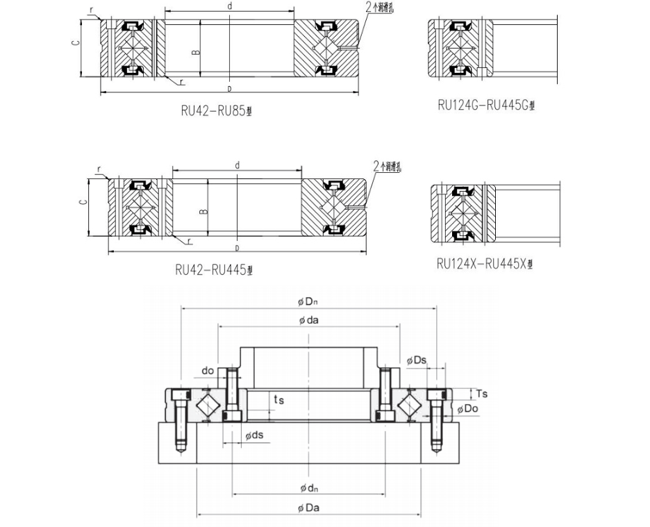 RU交叉滚子轴承的尺寸规格性能表如下: